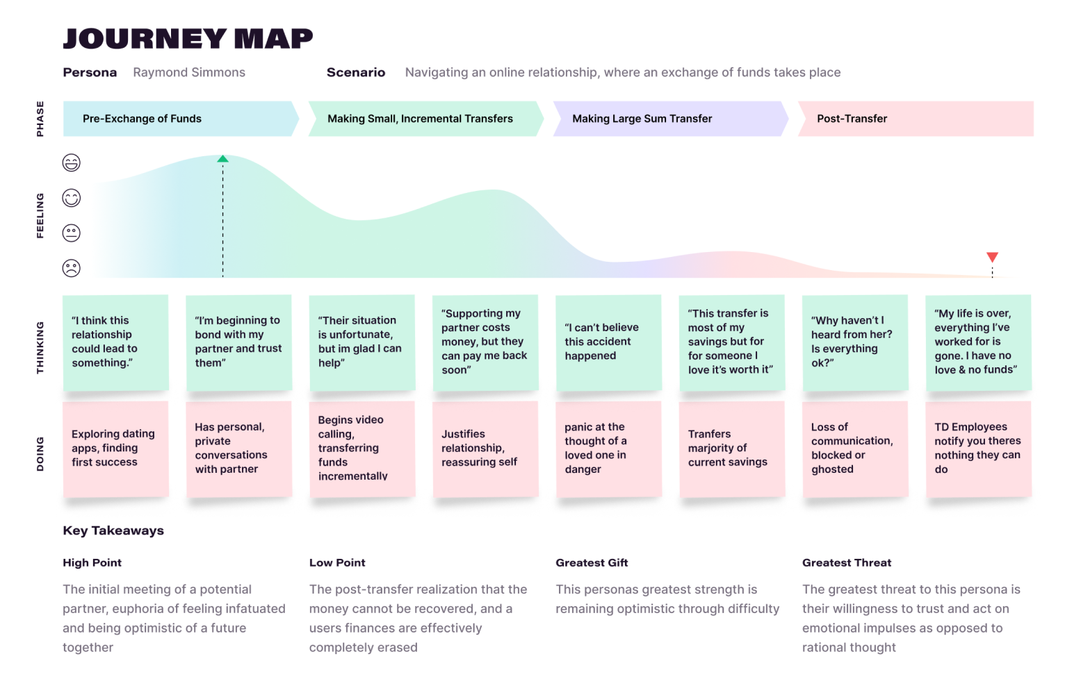 We created a journey map to illustrate Raymond's experience throughout the Romance Scam process. When first navigating a new relationship, Raymond is hopeful and begins to deeply trust his online companion/partner. After an unfortunate (and completely fabricated) accident, Raymond's partner is now asking for financial support. As a caring and worried partner, Raymond incrementally transfers more and more funds, culminating in large transfers that engross most of Raymond's savings. Raymond, believing this money was for an emergency, is now being ghosted by his partner. With no savings and no partner, Raymond is hopeless, panicked, and embarrassed.